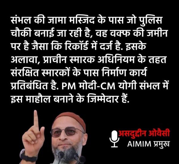 संभल में जामा मस्जिद के पास बन रही नई पुलिस चौकी को लेकर विवाद बढ़ता ही जा रहा है। इसी बीच एआईएमआईएम के नेता असदुद्दीन ओवैसी ने इसके निर्माण को लेकर क...