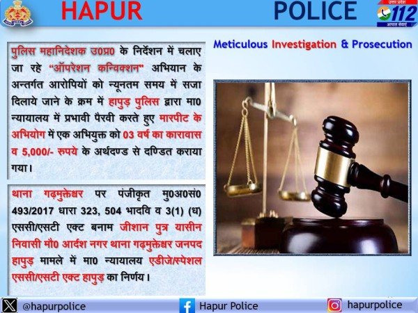 हापुड़हापुड़ पुलिस द्वारा मा0 न्यायालय में प्रभावी पैरवी करते हुए एक आरोपी को 03 वर्ष का सश्रम कारावास व 5,000/- रुपये के अर्थदण्ड से दण्डित कराया गया...